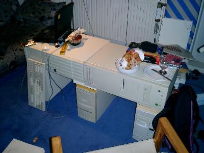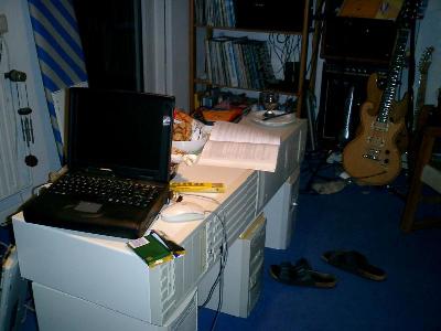 Oh, fast vergessen: auf dem Computertisch steht (am Suedende) --Ueberraschung!-- ein Computer. Der kleine schwarze Laptop ist ein 166er mit OS je nach Wechsel-Fesplatte (NetBSD / Linux / Plan9-Terminal, und fuer AirTransportPilot, den nettesten Fugsimulator aller Zeiten, auch mal Windows95).